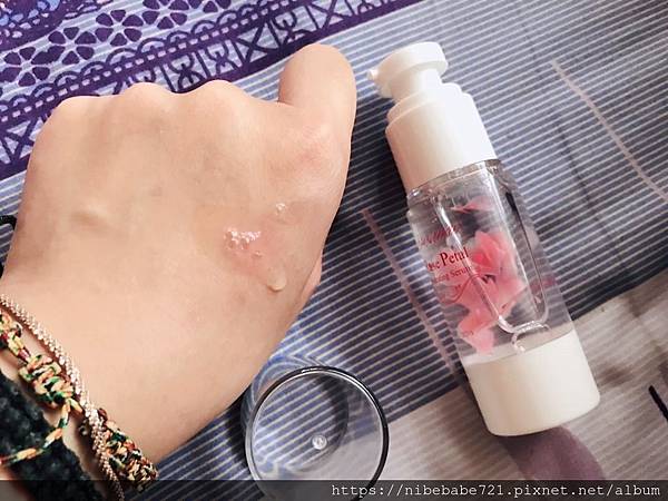 伴隨著中間透明處可以看到精華液及玫瑰花瓣,